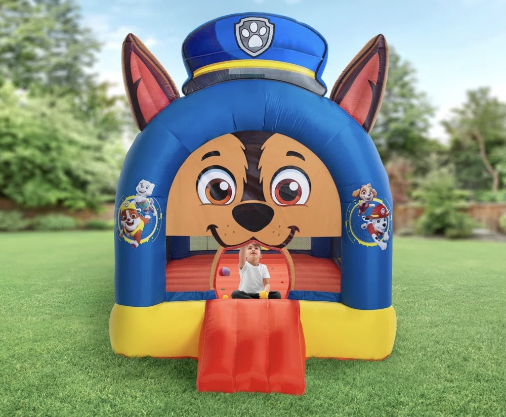 8 ‘W x 9”D x 11”H. This fun bounce house resembles Chase, the lovable police pup. Great for summer fun. Ask us about our Paw Patrol theme Birthday Parties!!! -